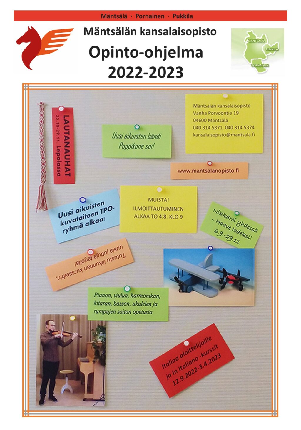 Mäntsälän kansalaisopiston ilmoittautuminen on alkanut torstaina 4.8.2022 klo 9.00. Painettu opinto-ohjelma on jaettu kotitalouksiin viikolla 31, jonka lisäksi ohjelman voi noutaa jakelupisteistä ja opistotalolta. Laajempi sähköinen opinto-ohjelma julkaistiin opiston kotisivuilla kesäkuun alussa.