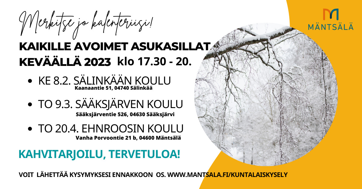 Mäntsälän kunta jatkaa kaikille asukkaille suunnattuja avoimia asukasiltoja. Asukasiltoihin ovat tervetulleita kaikki kuntalaiset. Kahvitarjoilu.