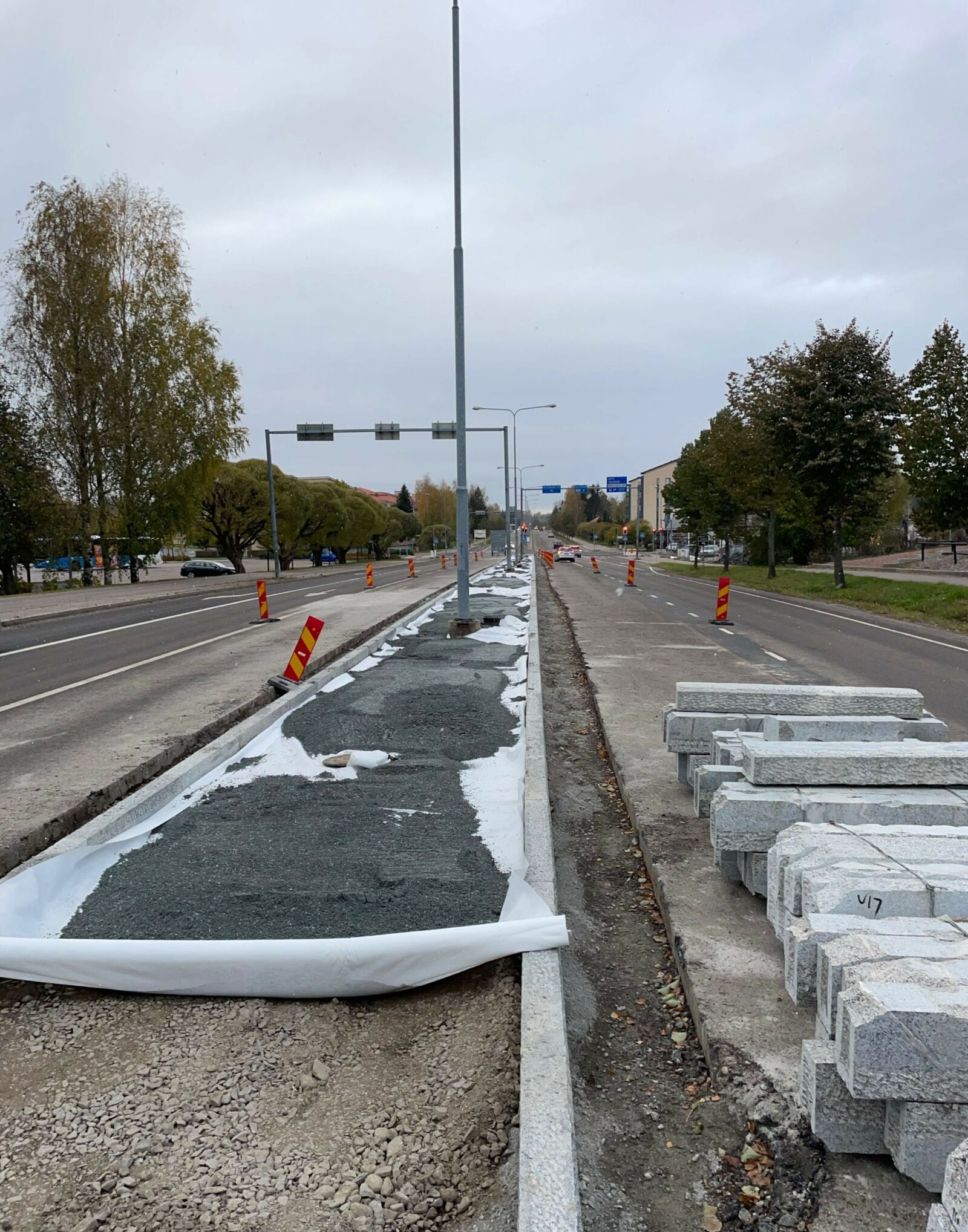 Reunakivityöt ovat valmistuneet Peltolantien ja Osuustien välille. Reunakivien asentamisen jälkeen osuudella aloitettiin kuitukankaan ja asennushiekan asennus (Kuvat: Welado Oy)