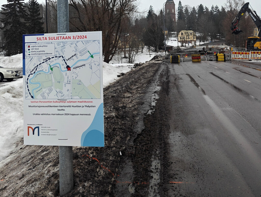 Kaukolämpölinjan tuennan teko on aloitettu viikolla 11 ja työt jatkuvat viikolla 12. Kevyen liikenteen sillan pintarakenteiden purkutyöt päästään aloittamaan maanantaina 18.3. alkavalla viikolla, sanoo kuntatekniikan päällikkö Jarkko Hämäläinen Mäntsälän kunnasta.